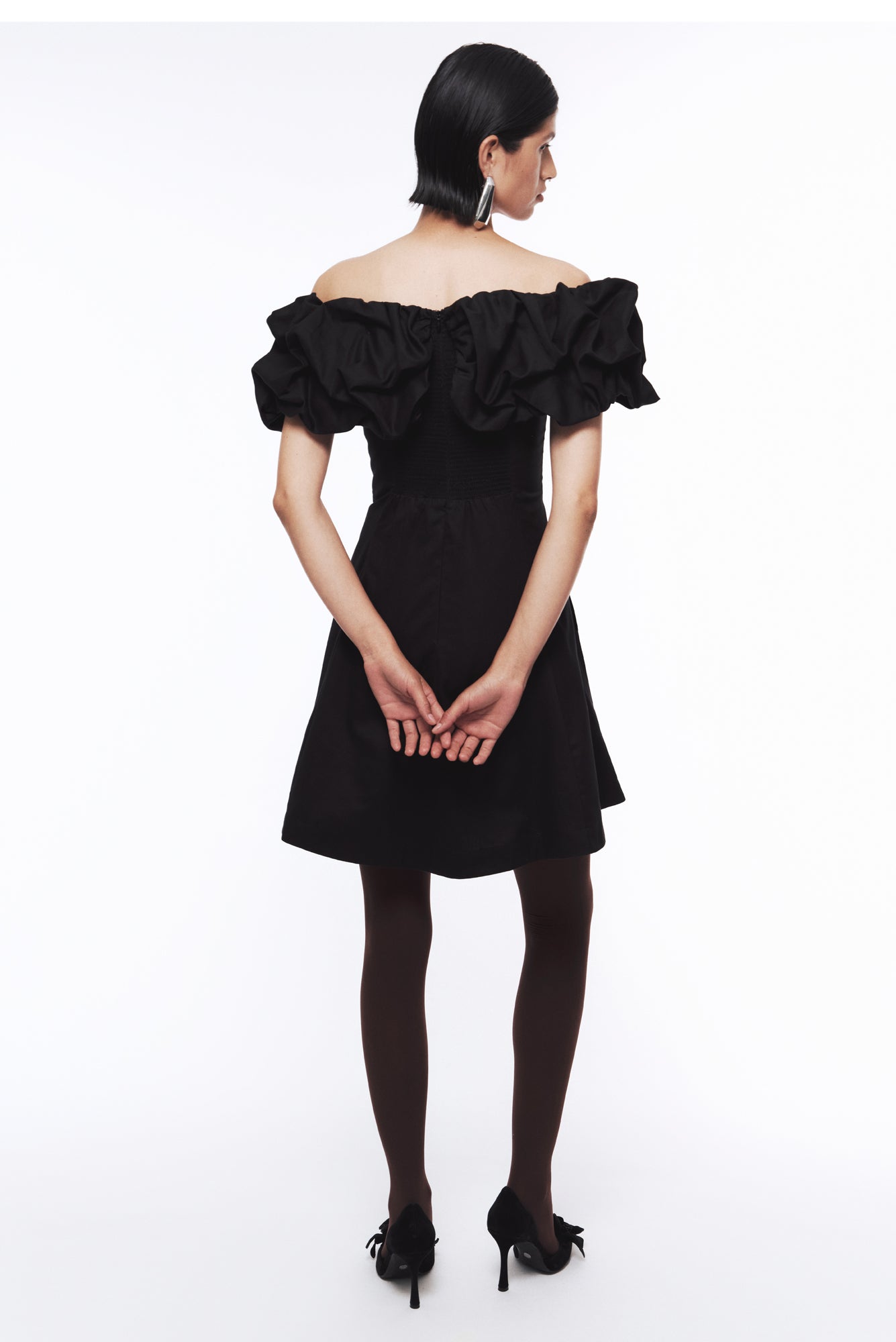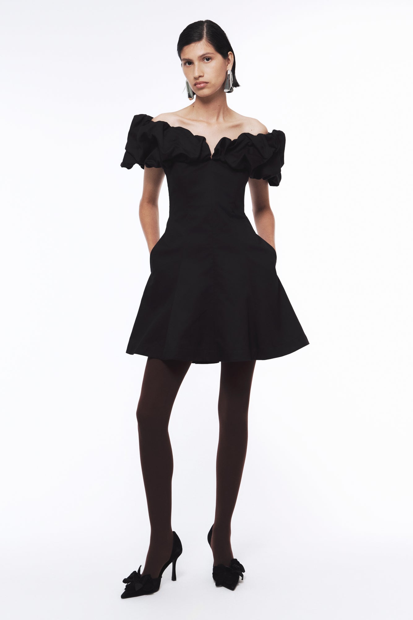 The Cumaral Mini Dress brings dramatic volume to a sleek silhouette. Designed with a deep sweetheart neckline and structured sleeves, this piece blends soft femininity with architectural lines. The fitted bodice flares into an A-line skirt, creating a flattering shape with movement. Style it with minimal accessories and sleek footwear for an effortless look.