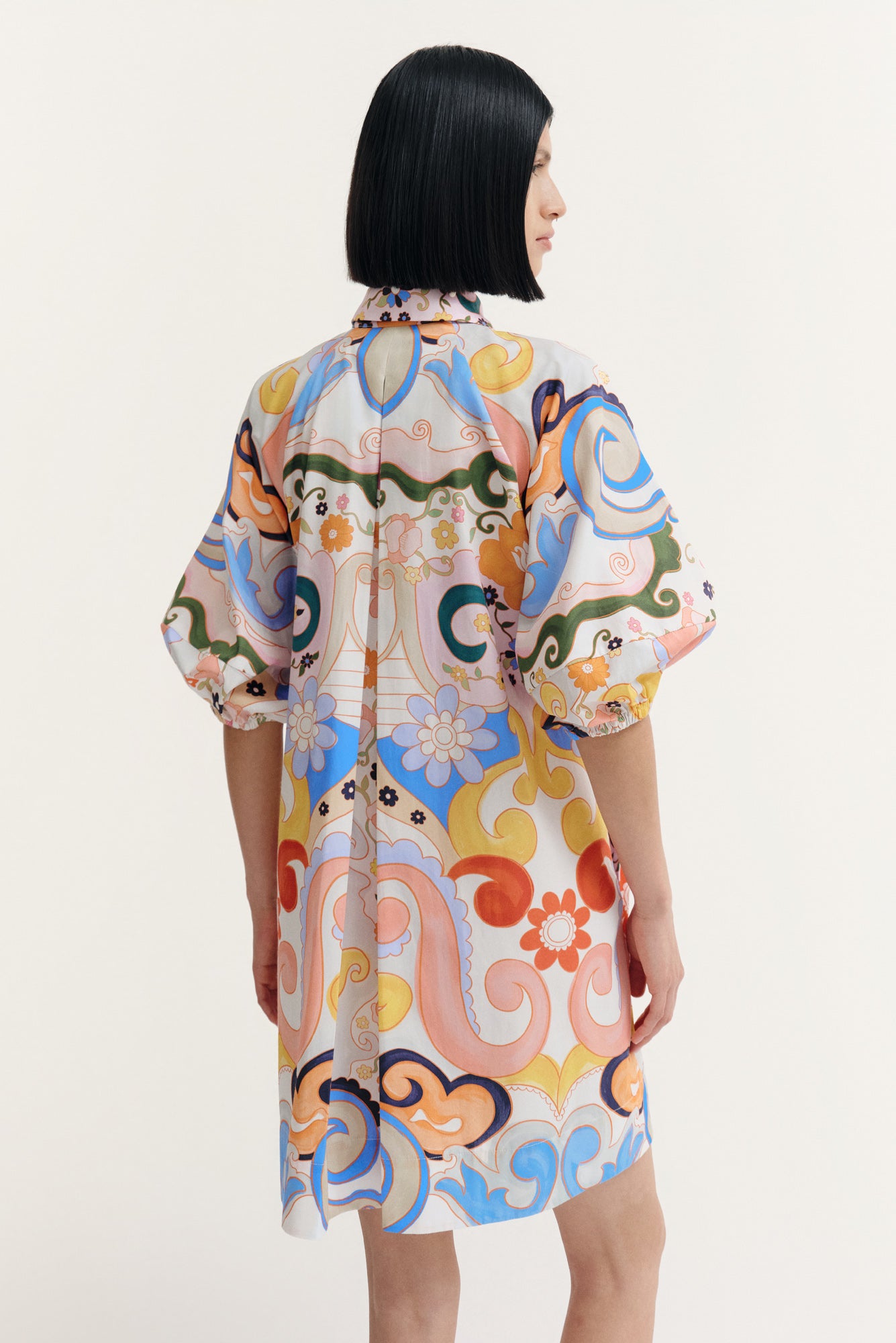 A vibrant twist on the classic shirtdress—this cotton mini pops with a bold tropical prina and the sculptural sleeves. Crafted for everyday ease with standout style.