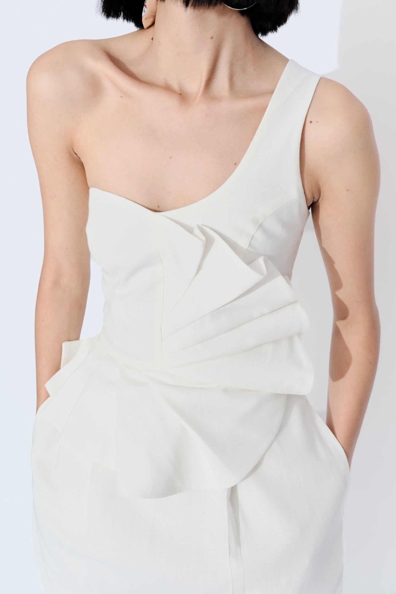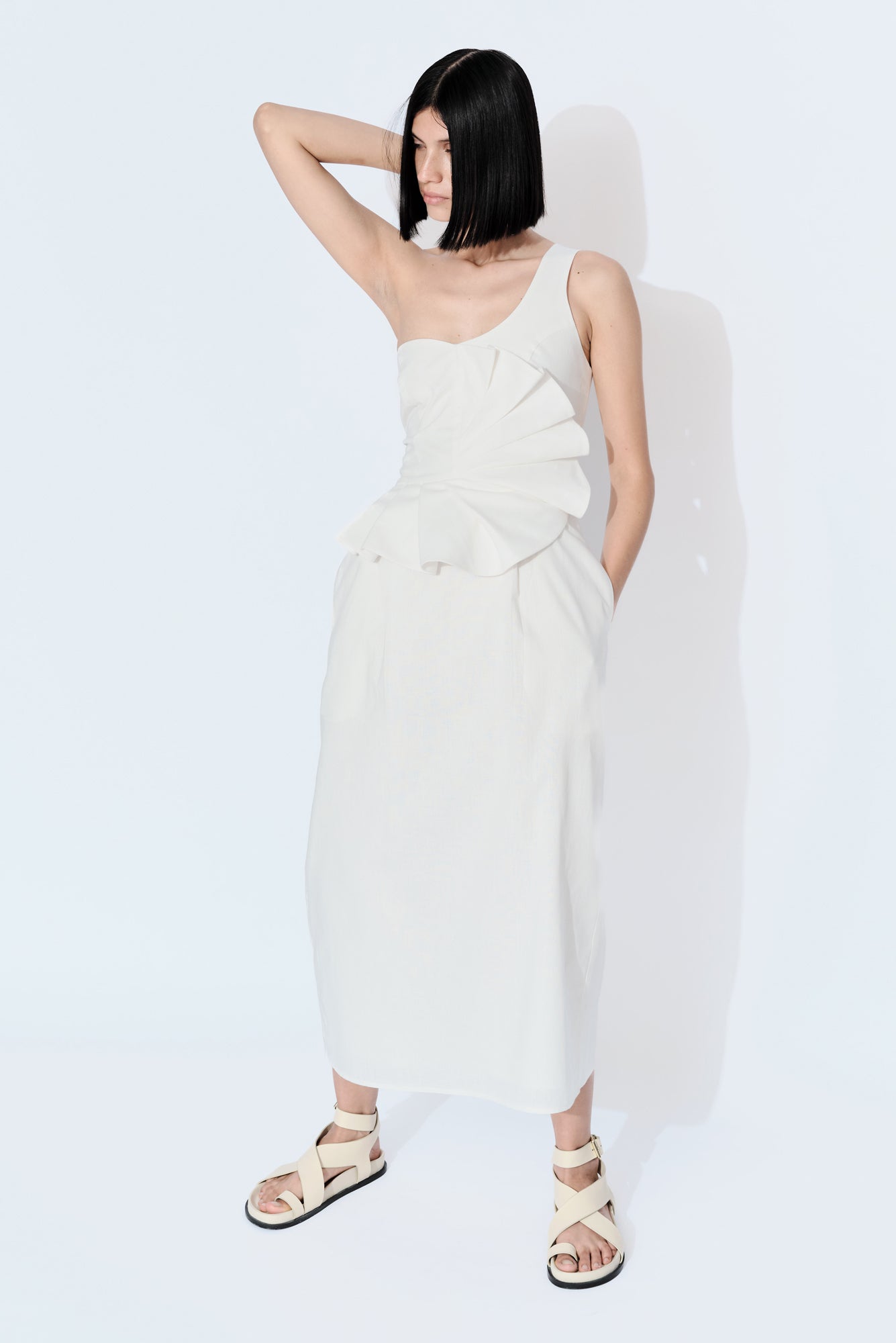 Striking yet effortless—this one-shoulder dress stuns with a beautiful pleated detail that moves with you. Made in Peru with bold femininity in mind.